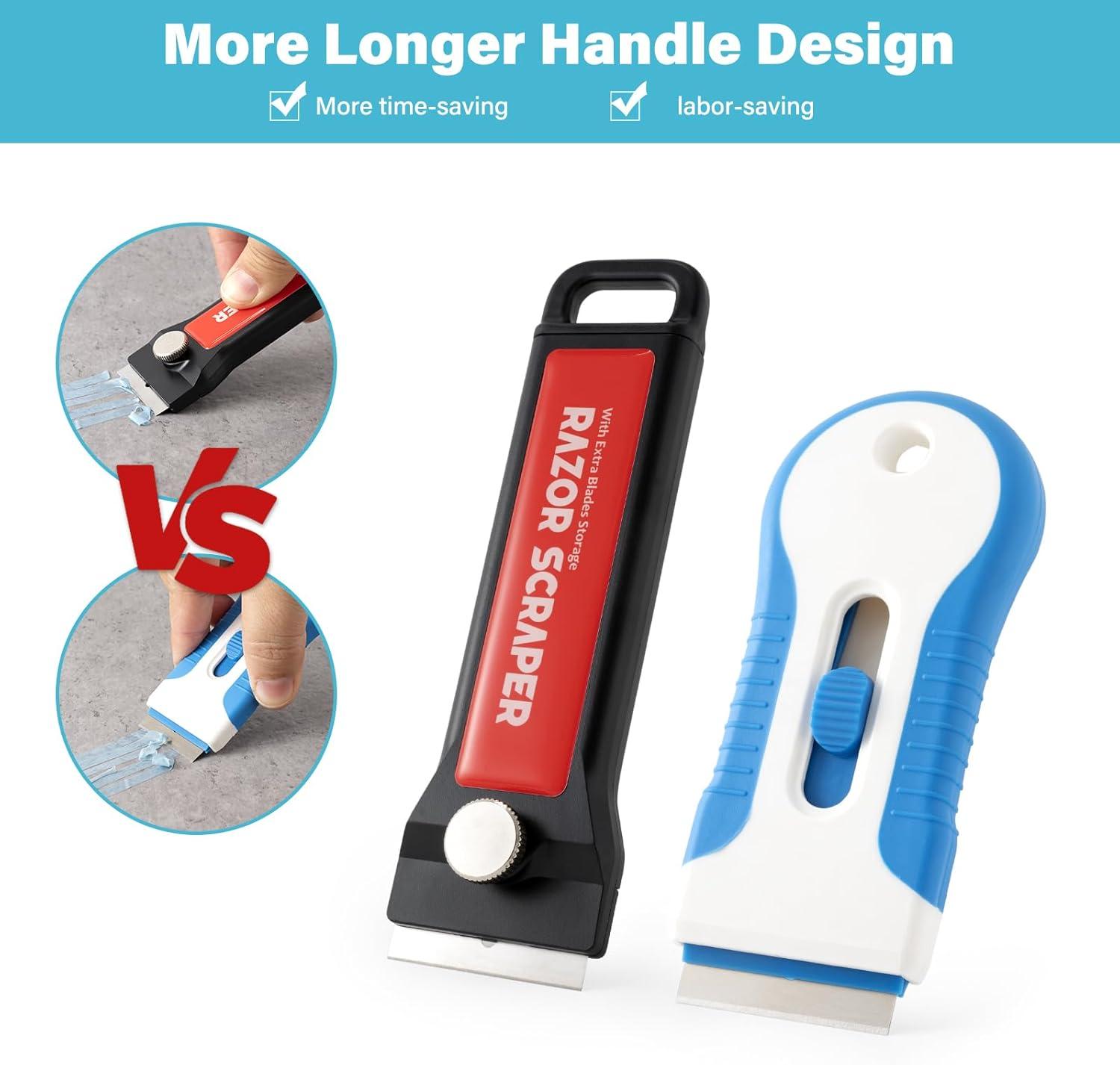 2PCS EFFECTIVE RAZOR SCRAPER TOOL: This 4″ wide flat razor scraper can clean a larger area than other mini razors. The ergonomic handle makes cleaning more labor-saving and efficient