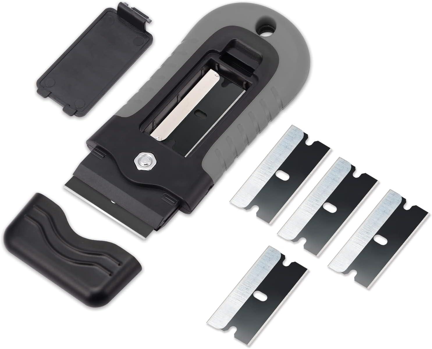 Gomake Locking Razor Blade Scraper with Safety Cap, Glass Cooktop Scraper with 10PCS Black Carbon Steel Blades for Glass Clean, Paint and Old Label,Decal Sticker Remover, Stove Top Scraper Tool(Grey With Black Blades)